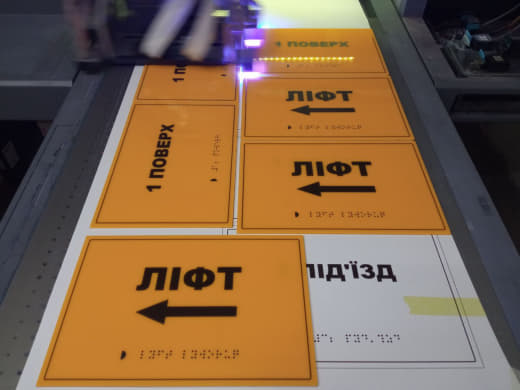 Також технологія УФ-друку дозволяє виробляти таблички Брайля.Такі таблички часто необхідні для офісів, громадських будівель, навчальних закладів та медичних установ.