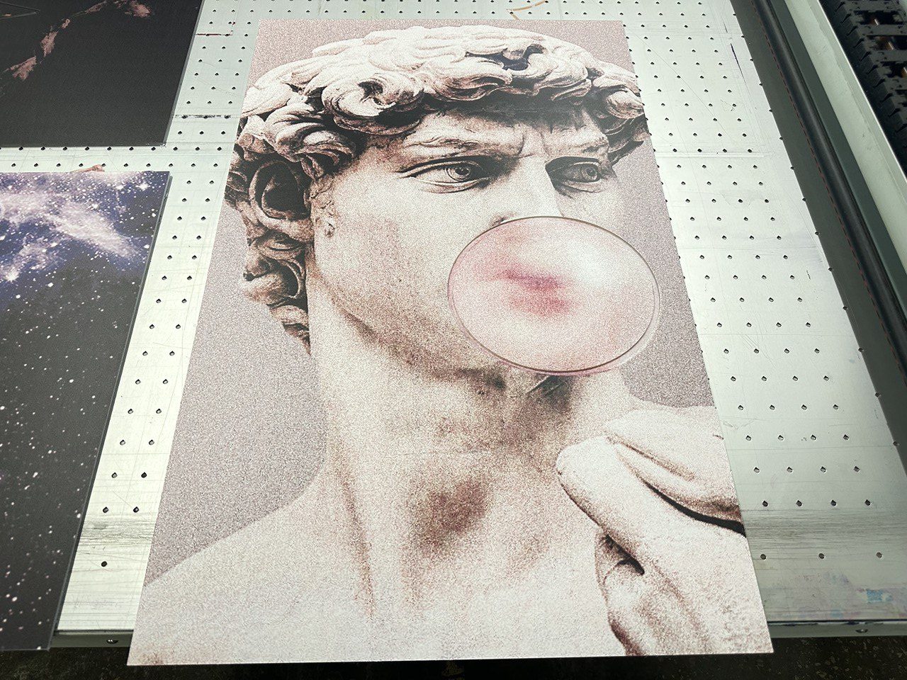 - Друга машина: великоформатний друк до 2,4 × 1,24 м з роздільною здатністю 1020 dpi, що дозволяє реалізовувати масштабні конструкції, декоративні панелі та вивіски без втрати якості.