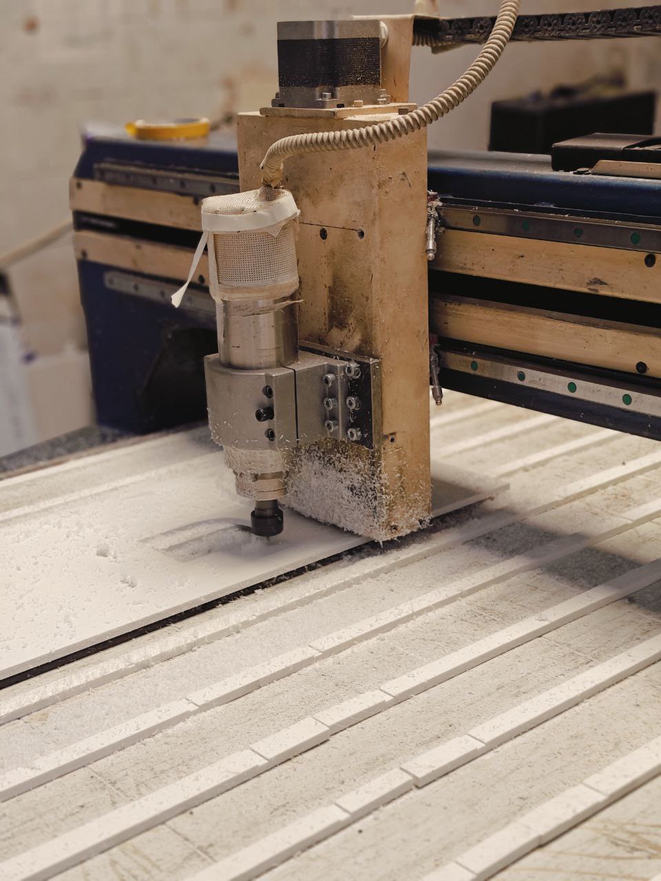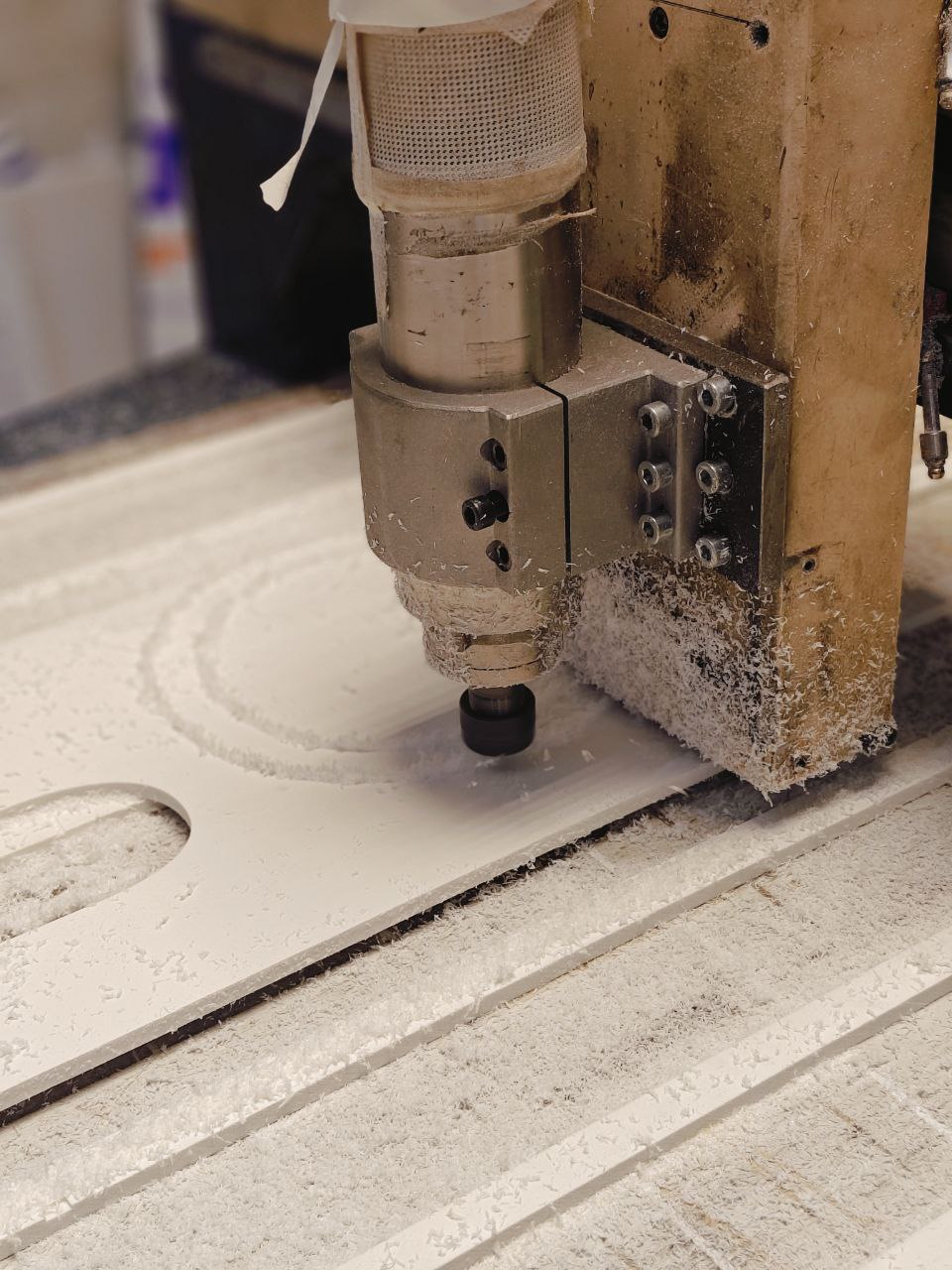 Фрезерування ПВХ у SPRINT здійснюється на високоточних верстатах з ЧПУ (числовим програмним керуванням), що дозволяє досягати стабільної якості і точності повторення деталей. Процес починається з підбору матеріалу та розробки макета, після чого заготовка завантажується у фрезерний станок.