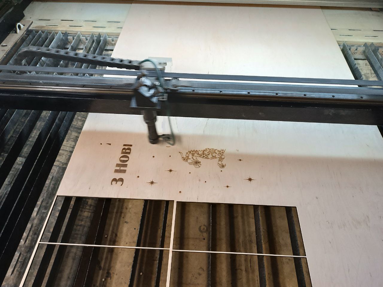 Процес починається з підготовки макета та закріплення фанерного листа на робочому столі. Ми налаштовуємо параметри глибини та швидкості гравіювання під конкретний тип фанери, щоб досягти оптимального контрасту та деталізації.