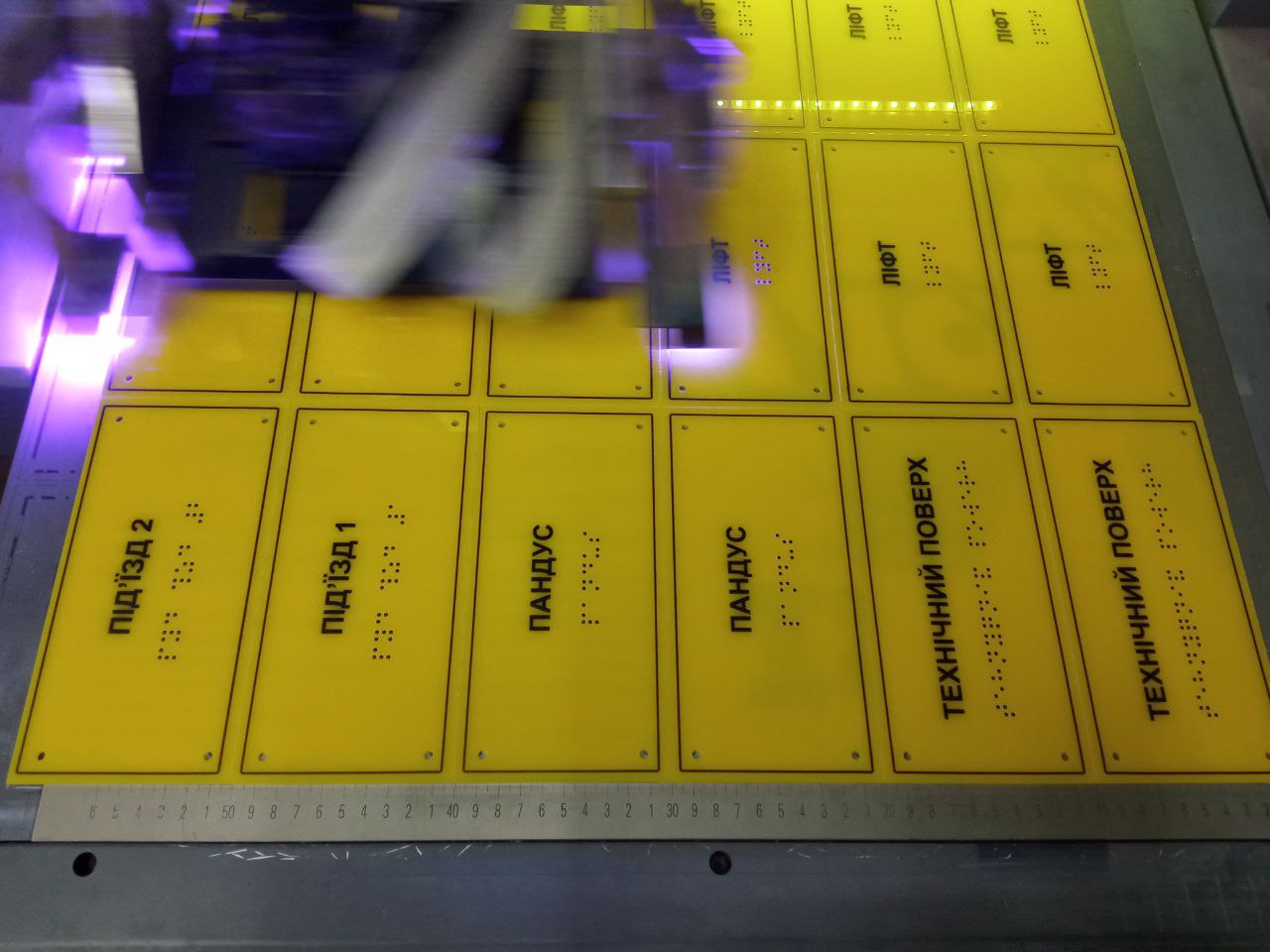 Ця технологія ідеально підходить для виготовлення табличок для офісів, громадських будівель, навчальних закладів і медичних установ. Таблички Брайля, виготовлені за допомогою УФ друку, не тільки мають високу чіткість, але й стійкі до зовнішніх впливів. Вони не бояться вологи, ультрафіолетового випромінювання та механічних пошкоджень.
